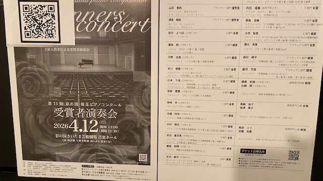 次の日曜日、4月12日さいたま芸術劇場音楽ホールにて埼玉ピアノコンクール入賞者としてこの教室に昔いた生徒さんがお二人出演されます。プログラムとチケット購入もこちらでも承っております。ご興味のおありになる方は、是非お声がけください。